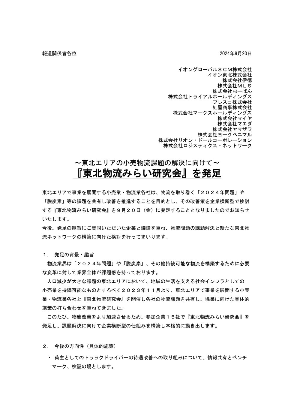 東北エリアの小売業各社は、物流を取り巻く「2024年問題」や「脱炭素」等の課題を共有し改善を推進することを目的とし、
