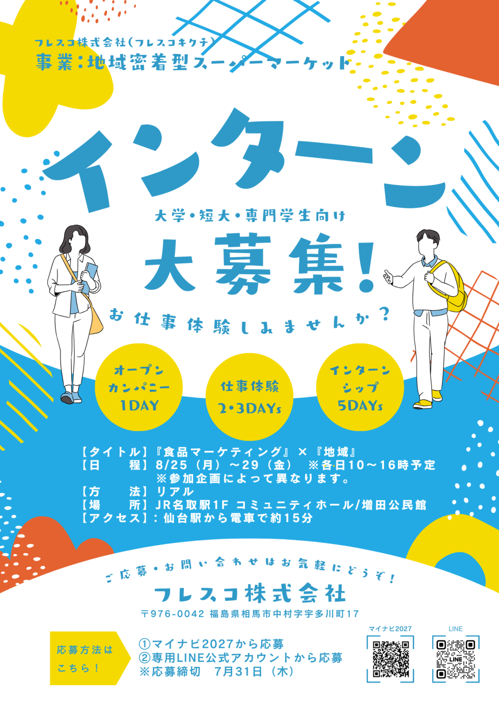 フレスコキクチではこの夏、大学・短大・専門学生を対象としたオープンカンパニー・就業体験・インターンシップを開催!興味のある方はぜひご応募ください。